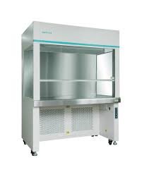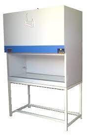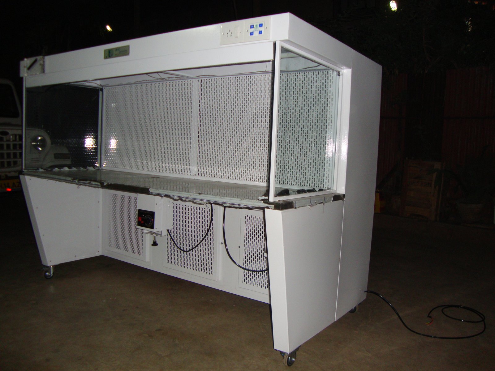 A vertical laminar flow clean bench draws air from under the hood, filters it with a high-efficiency particulate air (HEPA) filter, and then forces the air down across the workspace and out the hood at the user.